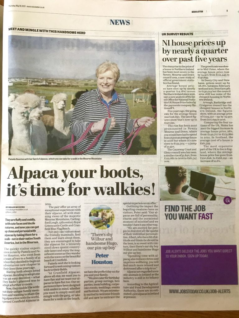 We were delighted to be featured in the Newsletter newspaper today, showcasing our range of alpaca experiences in the Mourne Mountains.