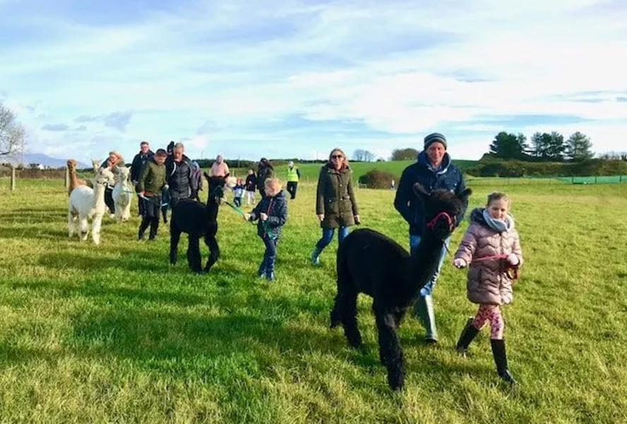 Our 60 minute Alpaca field walks are absolutely perfect for families with children of all ages. Take one of our gorgeous Alpacas for a walk around the paddocks and field with stunning views of the Mourne Mountains and Carlingford Lough. Spending time with our cute and cuddly alpacas, surrounded by the sounds of nature, just soothes those stresses and strains away, makes you smile and lifts your spirit – the perfect tonic to banish those winter blues. After working up an appetite, our Alpacas love to be hand fed by you and your family, and you can enjoy our picnic tables. Perfect for younger children or for Grandparents who want to take their Grandchildren for a stroll with our boys. No pets please. Please remember to wear waterproof footwear and suitable clothing for our ever changeable weather.